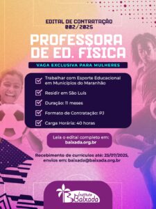 O Instituto Comunitário Baixada Maranhense torna público o Edital Nº 002 IB/2025 para a contratação de Profissionais de Educação Física na modalidade Pessoa Jurídica (PJ). As selecionadas atuarão no Projeto COPA DE FUTEBOL FEMININO – Trilhando no Esporte Educacional, promovendo atividades esportivas e educativas em 10 municípios do Maranhão.